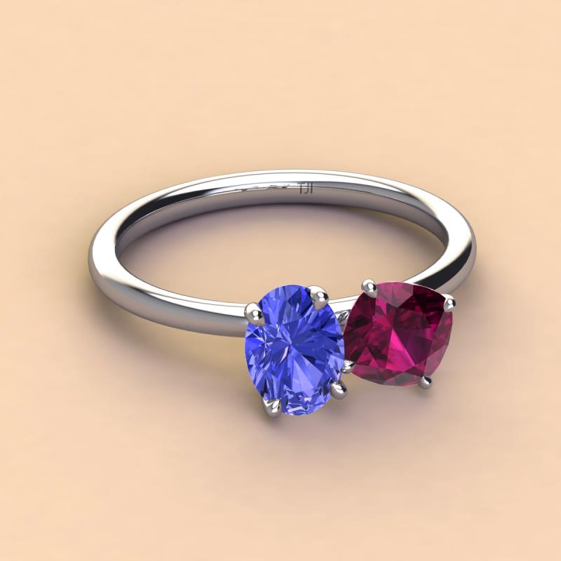 Two-stone Duo ring featuring an Oval shape Tanzanite and Cushion shape Rhodolite Garnet crafted beautifully that will effortlessly blend with her casual outfits and evening dresses.