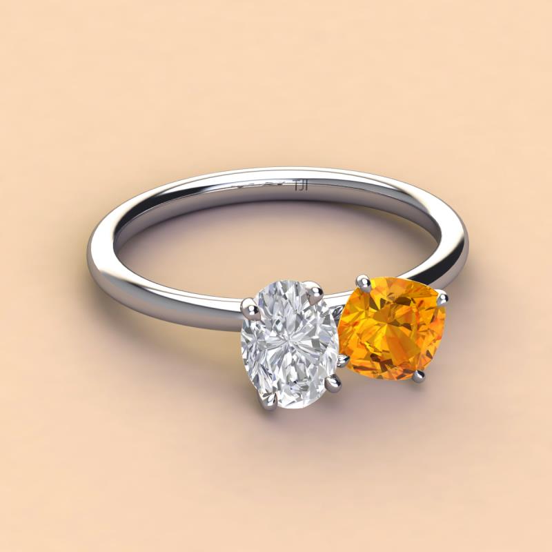 Two-stone Duo ring featuring an Oval shape White Sapphire and Cushion shape Citrine crafted beautifully that will effortlessly blend with her casual outfits and evening dresses.