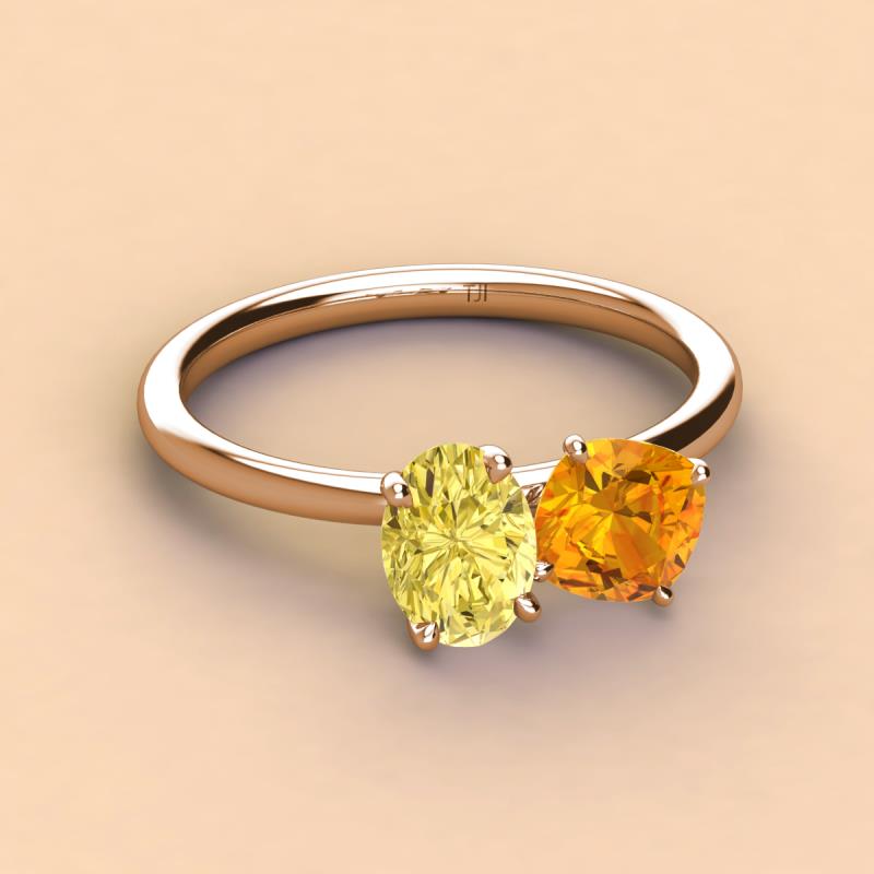 Two-stone Duo ring featuring an Oval shape Yellow Sapphire and Cushion shape Citrine crafted beautifully that will effortlessly blend with her casual outfits and evening dresses.