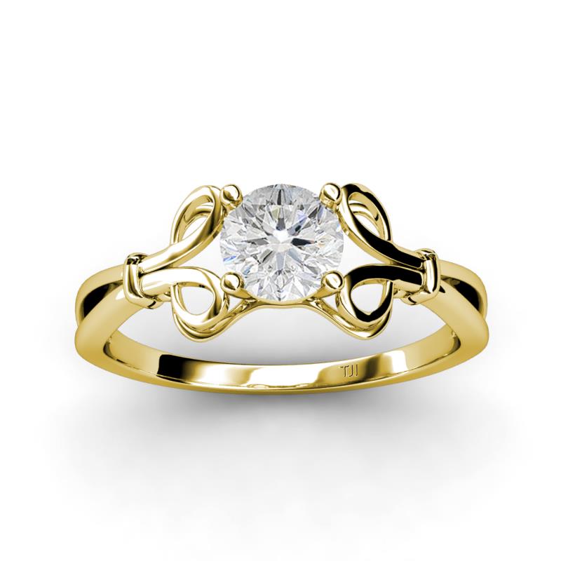 This 0.92 ct Solitaire Ring presents prong set White Sapphire surrounded in an Elegant drape of Floral Motif making it more Graceful in its Simplicity.