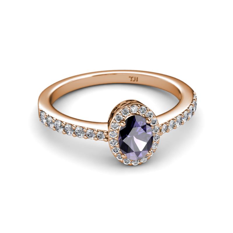 Impressive Engagement Ring Embodies an Oval Iolite enriched by halo of prong set Diamond that showcases luxury and is sure to give immense presence on the hand.