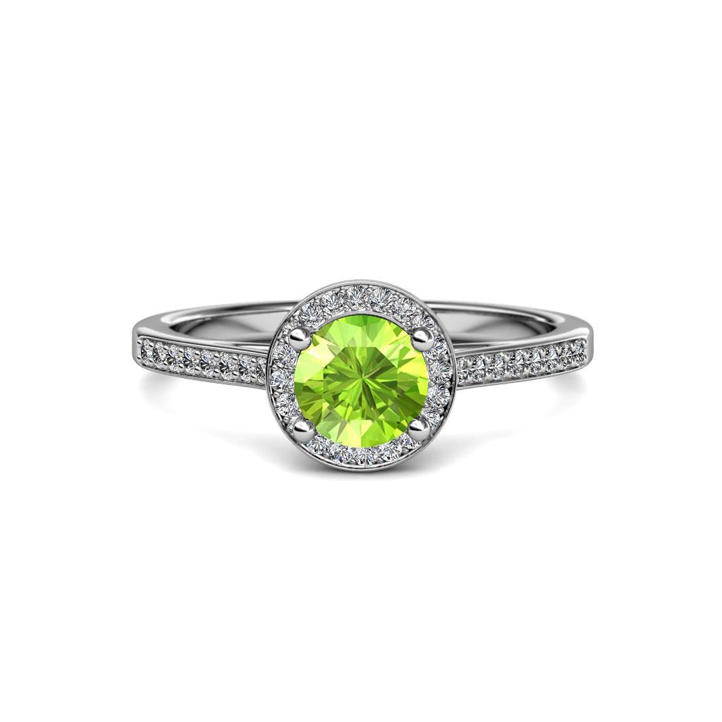 Enchanting the timeless vow which a couple makes to one another this Peg Head Peridot Halo Engagement Ring along with single row of pave set Diamonds and open knot cut out undergallery work symbolizes the eternal love which will certainly win your spouse's heart.