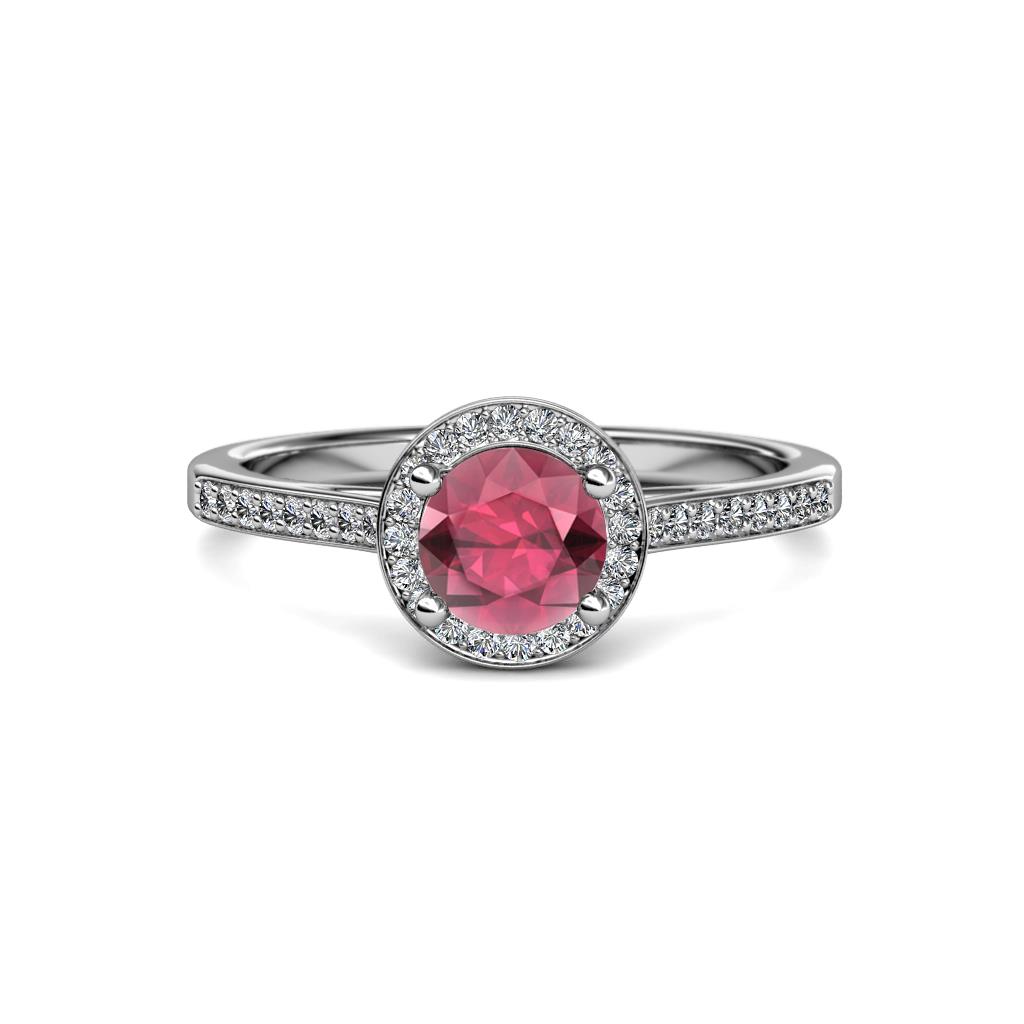 Enchanting the timeless vow which a couple makes to one another this Peg Head Rhodolite Garnet Halo Engagement Ring along with single row of pave set Diamonds and open knot cut out undergallery work symbolizes the eternal love which will certainly win your spouse's heart.