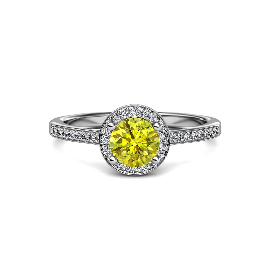 Enchanting the timeless vow which a couple makes to one another this Peg Head Yellow Diamond Halo Engagement Ring along with single row of pave set Diamonds and open knot cut out undergallery work symbolizes the eternal love which will certainly win your spouse's heart.