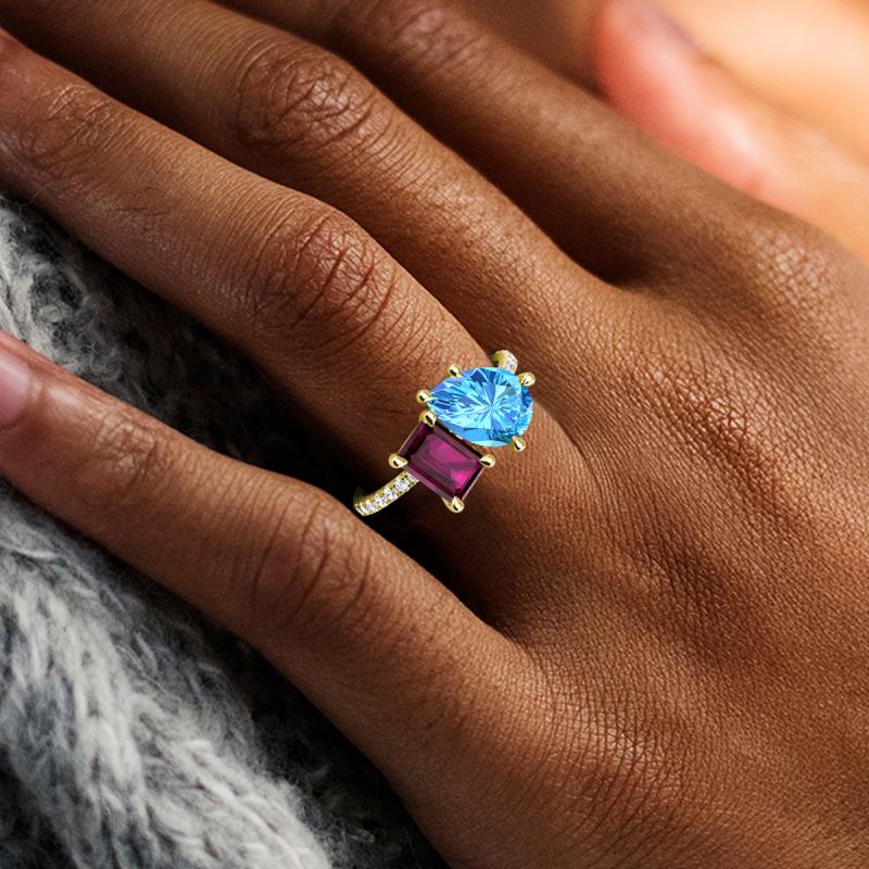 Contrasting stones gives a 2 stone duo ring a fashion-forward vibe. Crafted with Pear Blue Topaz and an Emerald Cut Rhodolite Garnet with 16 diamonds studded on the polished shoulders of the stunning ring for enhanced beauty.
