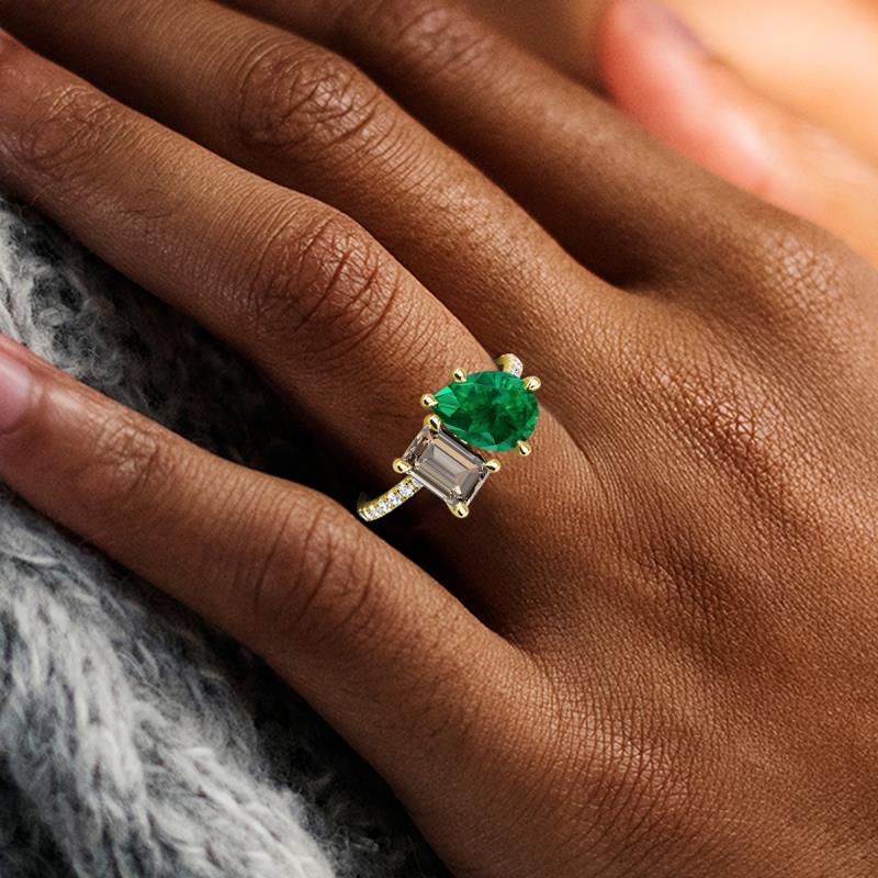 Contrasting stones gives a 2 stone duo ring a fashion-forward vibe. Crafted with Pear Emerald and Emerald Cut Smoky Quartz with 16 diamonds studded on the polished shoulders of the stunning ring for enhanced beauty.