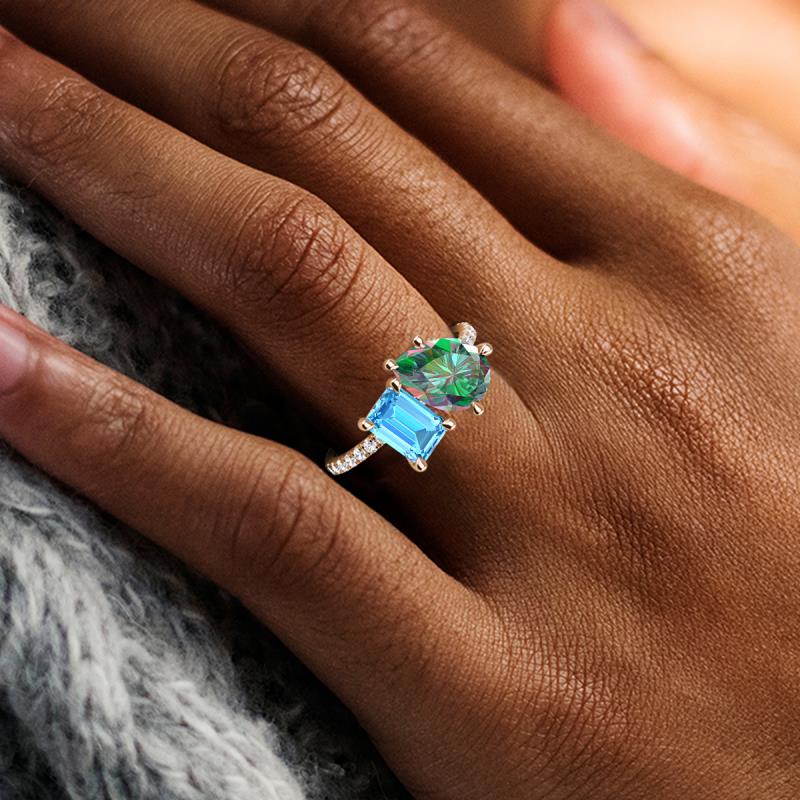 Contrasting stones gives a 2 stone duo ring a fashion-forward vibe. Crafted with Pear Lab Created Alexandrite and an Emerald Cut Blue Topaz with 16 diamonds studded on the polished shoulders of the stunning ring for enhanced beauty.