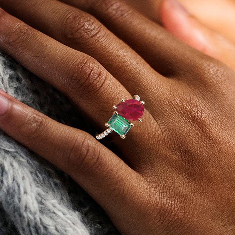 Contrasting stones gives a 2 stone duo ring a fashion-forward vibe. Crafted with Pear Ruby and Emerald Cut Lab Created Alexandrite with 16 diamonds studded on the polished shoulders of the stunning ring for enhanced beauty.