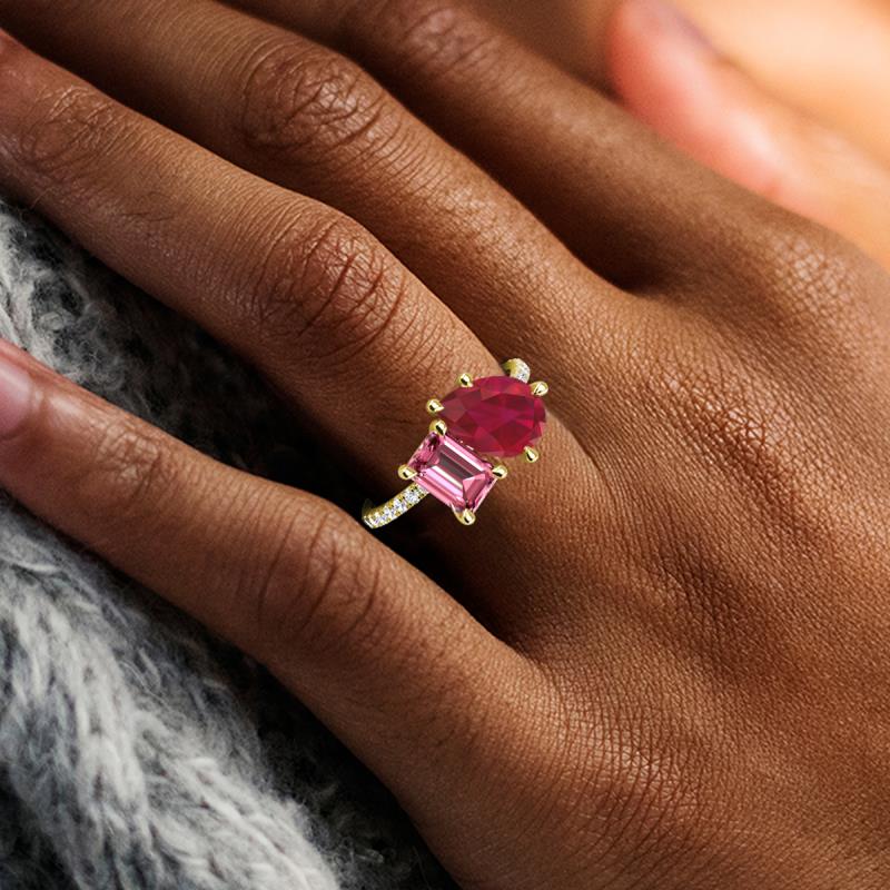 Contrasting stones gives a 2 stone duo ring a fashion-forward vibe. Crafted with Pear Ruby and Emerald Cut Pink Tourmaline with 16 diamonds studded on the polished shoulders of the stunning ring for enhanced beauty.