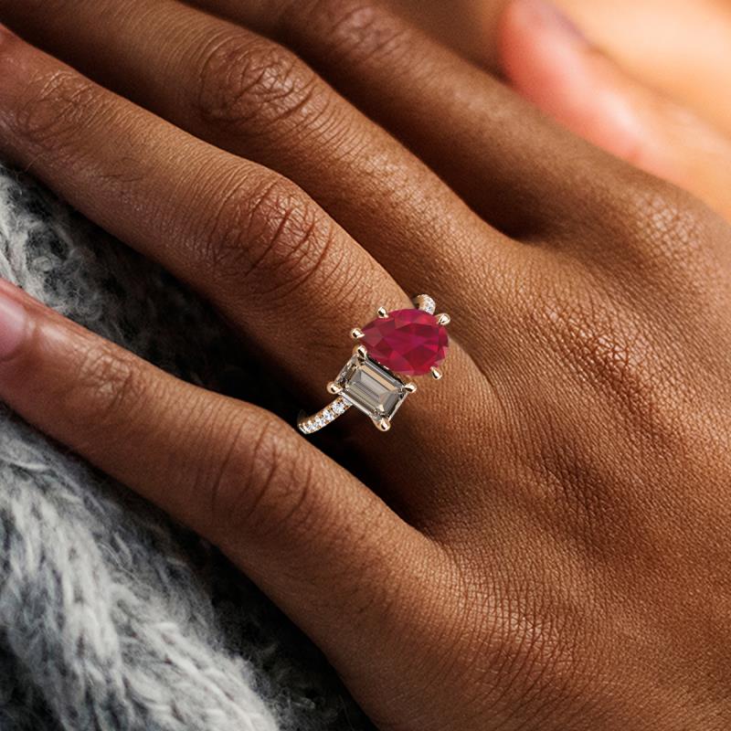 Contrasting stones gives a 2 stone duo ring a fashion-forward vibe. Crafted with Pear Ruby and Emerald Cut Smoky Quartz with 16 diamonds studded on the polished shoulders of the stunning ring for enhanced beauty.