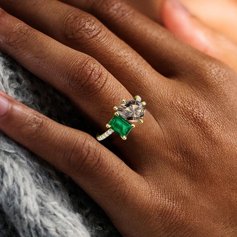 Contrasting stones gives a 2 stone duo ring a fashion-forward vibe. Crafted with Pear Smoky Quartz and an Emerald Cutd Lab Created Emerald with 16 diamonds studded on the polished shoulders of the stunning ring for enhanced beauty.