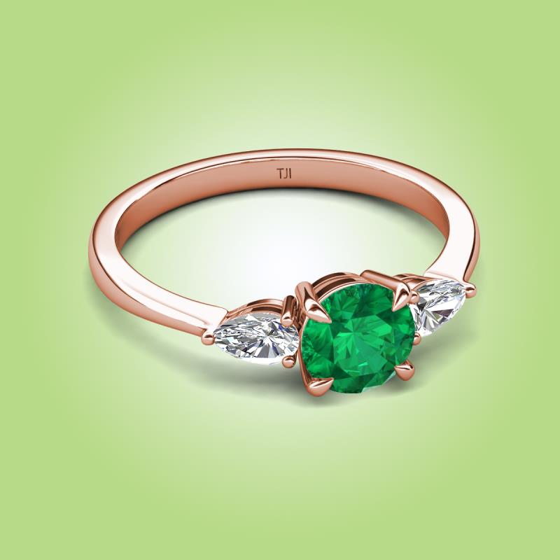 As a symbol of the beautiful journey, with this Three Stone Engagement Ring of 1.14 ctw with centre Round Emerald and side Pear shape Lab Grown Diamond that two people embark upon when they decide to spend their lives together.