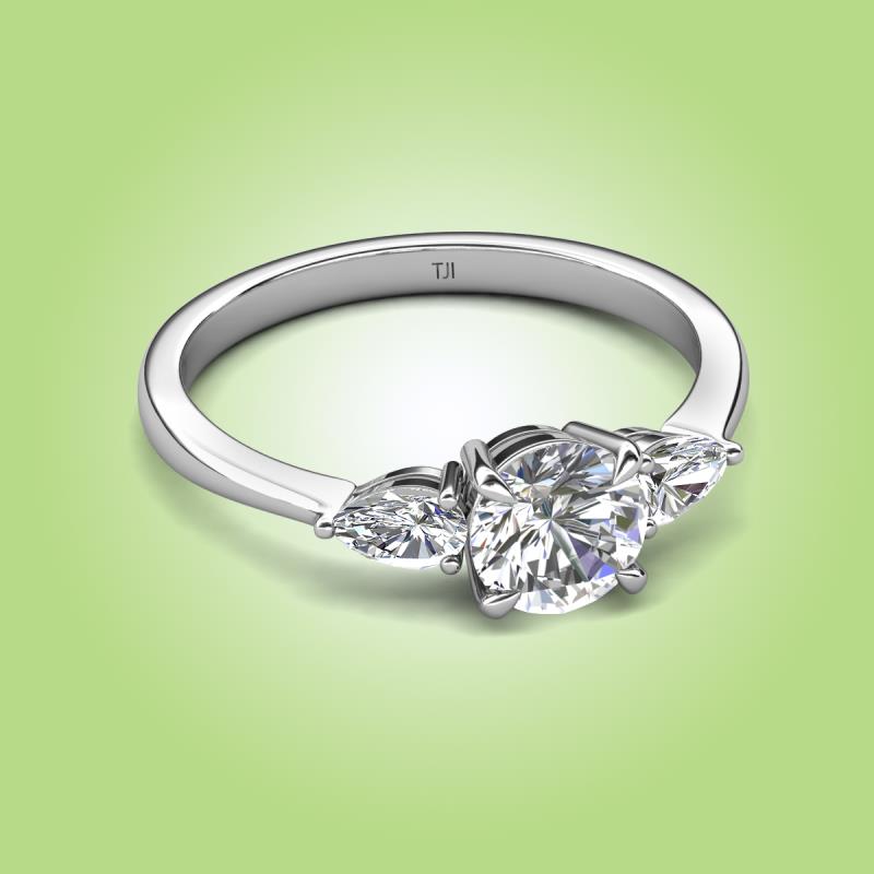 As a symbol of the beautiful journey, with this Three Stone Engagement Ring of 1.34 ctw with centre Round Moissanite and side Pear shape Lab Grown Diamond that two people embark upon when they decide to spend their lives together.