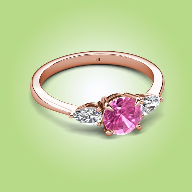 • 1 Round Pink Sapphire of 0.95 ct / 6.00 mm and 2 Pear shape Lab Grown Diamond of 0.34 ctw / 5x3 mm set using Tiger Claw Four Prong Setting. Learn more