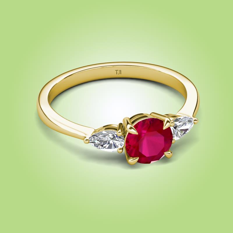 1.29 ctw Ruby (6.00 mm) and Pear Shape Lab Grown Diamond Women Three Stone Engagement Ring in 14K Yellow Gold More Details ...