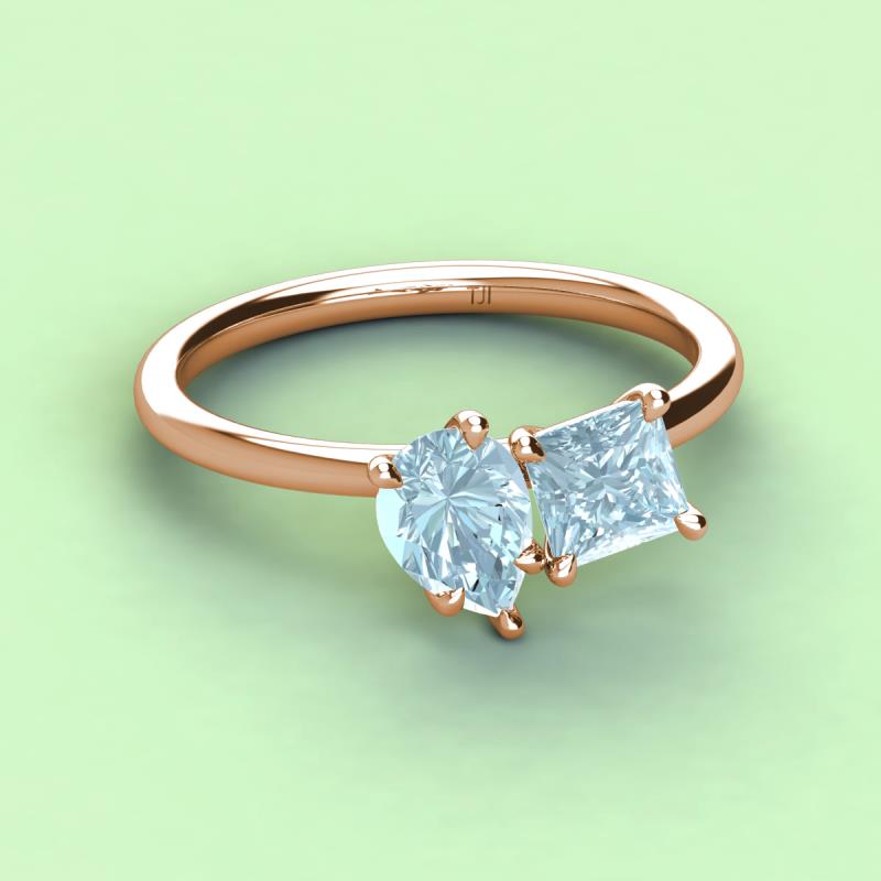 A beautiful symbol of everlasting love, this duo two-stone ring showcases a pair of Pear Shape Aquamarine shimmering alongside of a luminous Princess Shape Aquamarine crafted beautifully that represents two of you together.