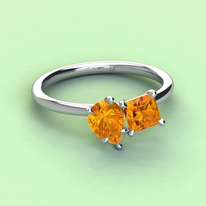 A beautiful symbol of everlasting love, this duo two-stone ring showcases a pair of Pear Shape Citrine shimmering alongside of a luminous Princess Shape Citrine crafted beautifully that represents two of you together.