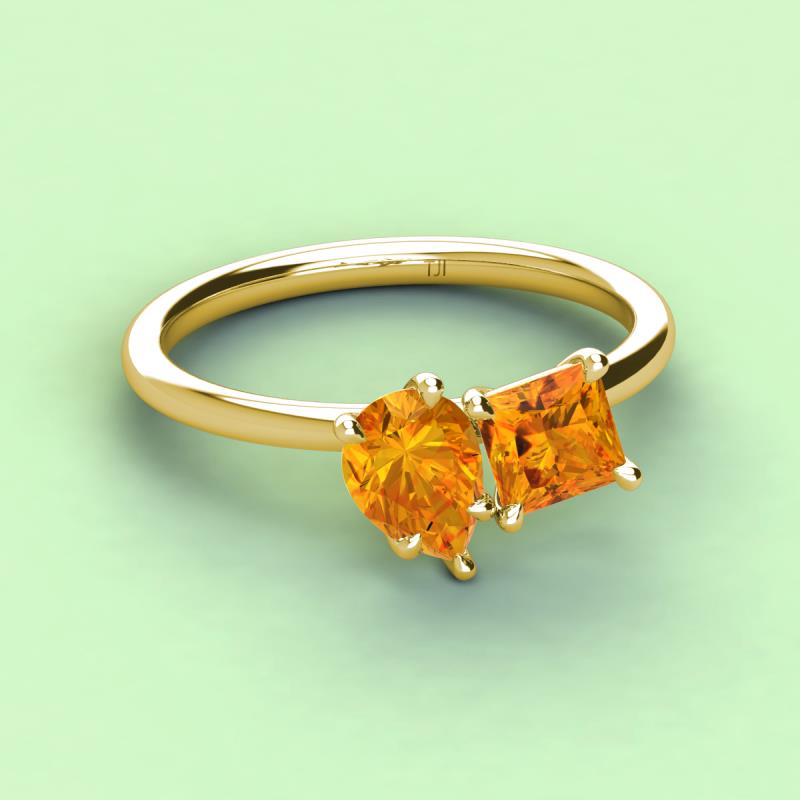 A beautiful symbol of everlasting love, this duo two-stone ring showcases a pair of Pear Shape Citrine shimmering alongside of a luminous Princess Shape Citrine crafted beautifully that represents two of you together.