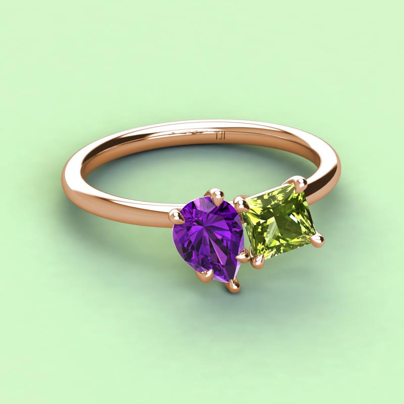 A beautiful symbol of everlasting love, this duo two-stone ring showcases a pair of Pear Shape Amethyst shimmering alongside of a luminous Princess Shape Peridot crafted beautifully that represents two of you together.