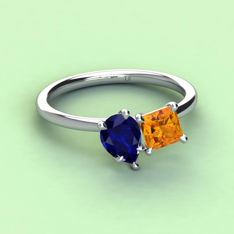 A beautiful symbol of everlasting love, this duo two-stone ring showcases a pair of Pear Shape Blue Sapphire shimmering alongside of a luminous Princess Shape Citrine crafted beautifully that represents two of you together.