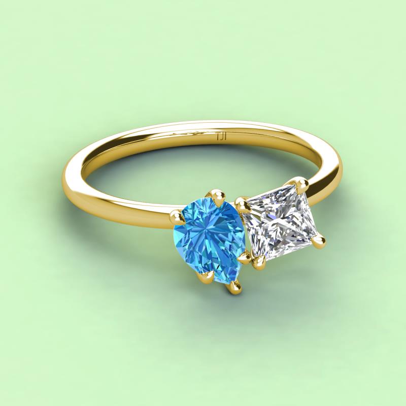 Pear Shape Blue Topaz & Princess Shape Forever Brilliant Moissanite 2.83 ctw Four Prong Womens 2 Stone Duo Engagement Ring 14K Yellow Gold More Details ...