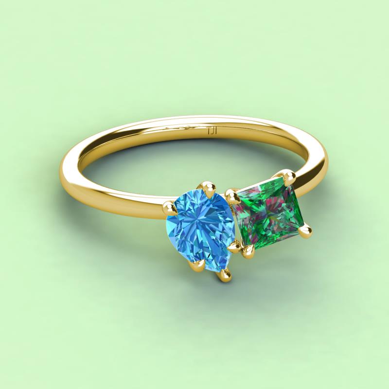 A beautiful symbol of everlasting love, this duo two-stone ring showcases a pair of Pear Shape Blue Topaz shimmering alongside of a luminous Princess Shape Lab Created Alexandrite crafted beautifully that represents two of you together.