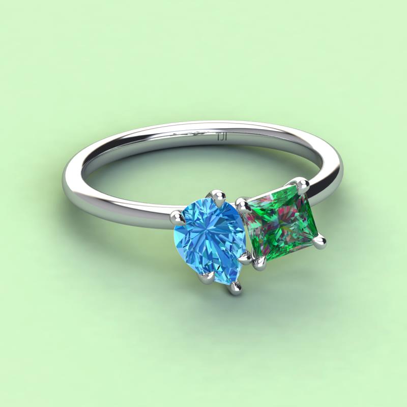 A beautiful symbol of everlasting love, this duo two-stone ring showcases a pair of Pear Shape Blue Topaz shimmering alongside of a luminous Princess Shape Lab Created Alexandrite crafted beautifully that represents two of you together.