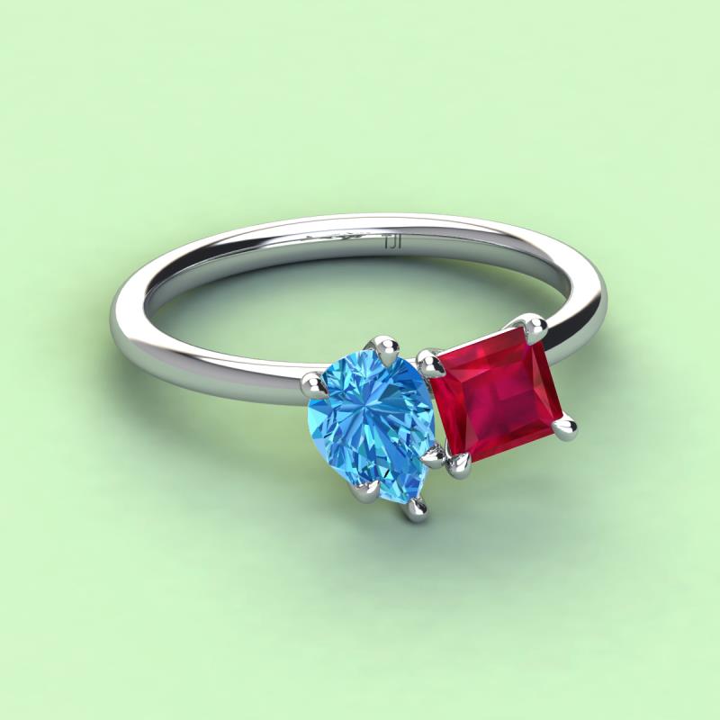 A beautiful symbol of everlasting love, this duo two-stone ring showcases a pair of Pear Shape Blue Topaz shimmering alongside of a luminous Princess Shape Lab Created Ruby crafted beautifully that represents two of you together.