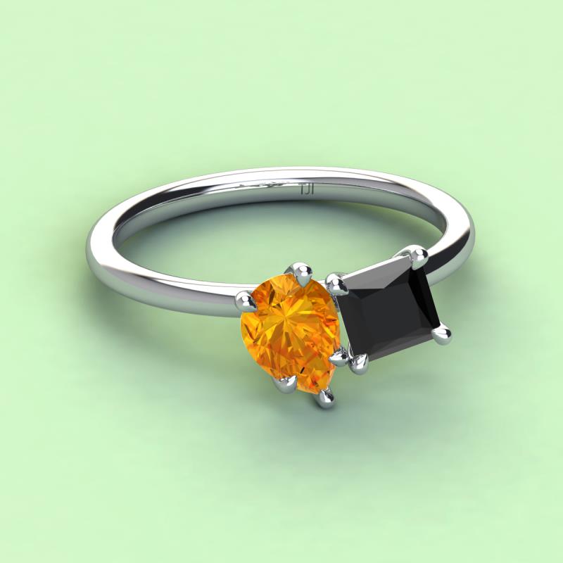 A beautiful symbol of everlasting love, this duo two-stone ring showcases a pair of Pear Shape Citrine shimmering alongside of a luminous Princess Shape Black Diamond crafted beautifully that represents two of you together.