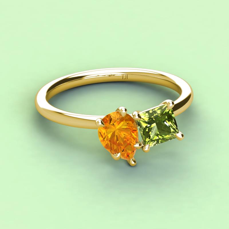A beautiful symbol of everlasting love, this duo two-stone ring showcases a pair of Pear Shape Citrine shimmering alongside of a luminous Princess Shape Peridot crafted beautifully that represents two of you together.