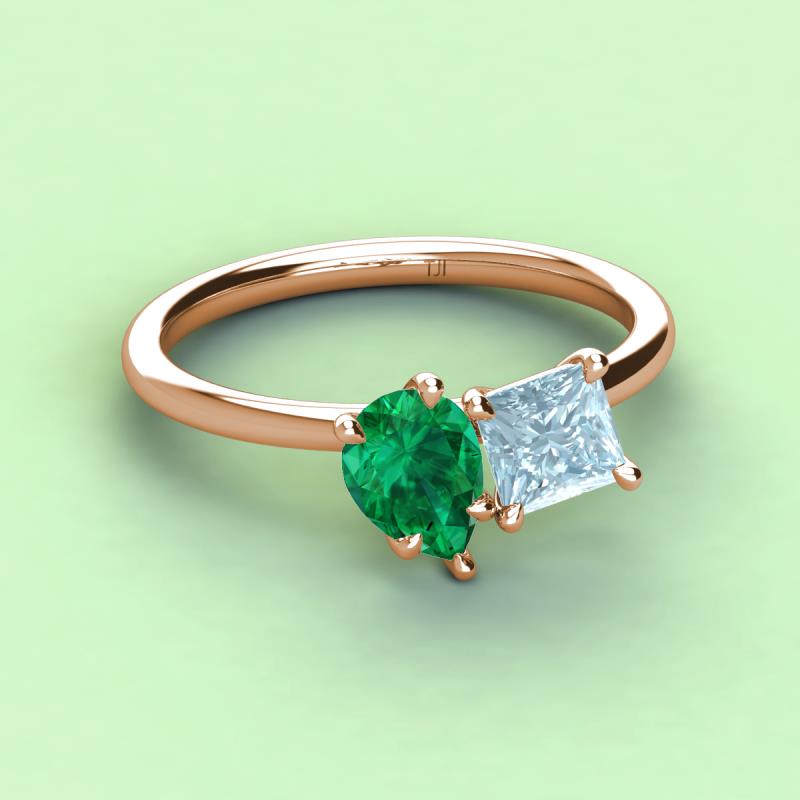 A beautiful symbol of everlasting love, this duo two-stone ring showcases a pair of Pear Shape Emerald shimmering alongside of a luminous Princess Shape Aquamarine crafted beautifully that represents two of you together.