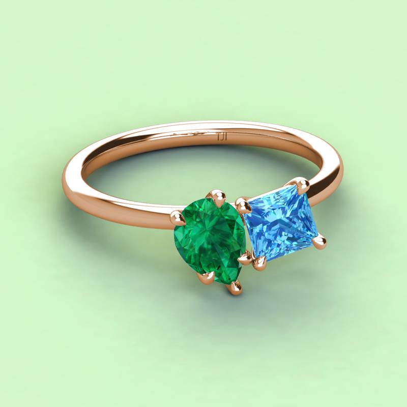 A beautiful symbol of everlasting love, this duo two-stone ring showcases a pair of Pear Shape Emerald shimmering alongside of a luminous Princess Shape Blue Topaz crafted beautifully that represents two of you together.