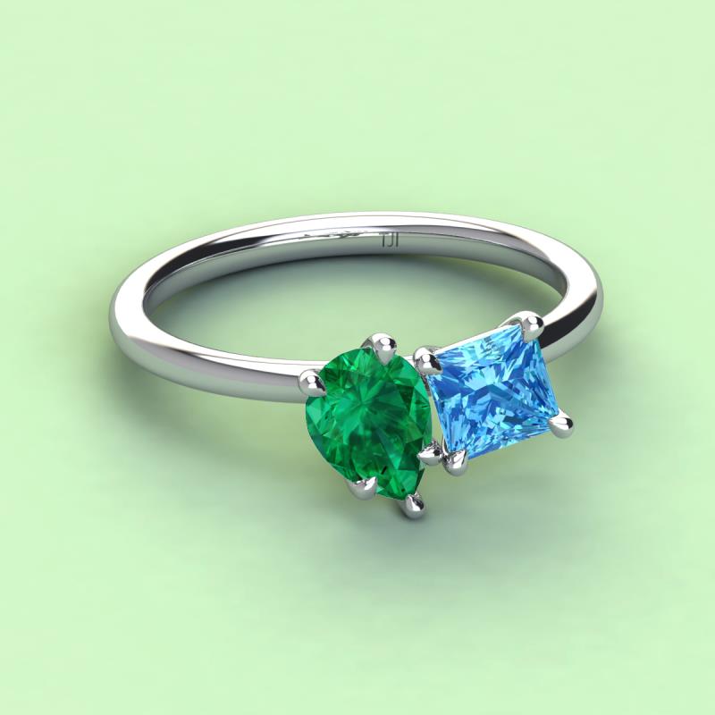 A beautiful symbol of everlasting love, this duo two-stone ring showcases a pair of Pear Shape Emerald shimmering alongside of a luminous Princess Shape Blue Topaz crafted beautifully that represents two of you together.
