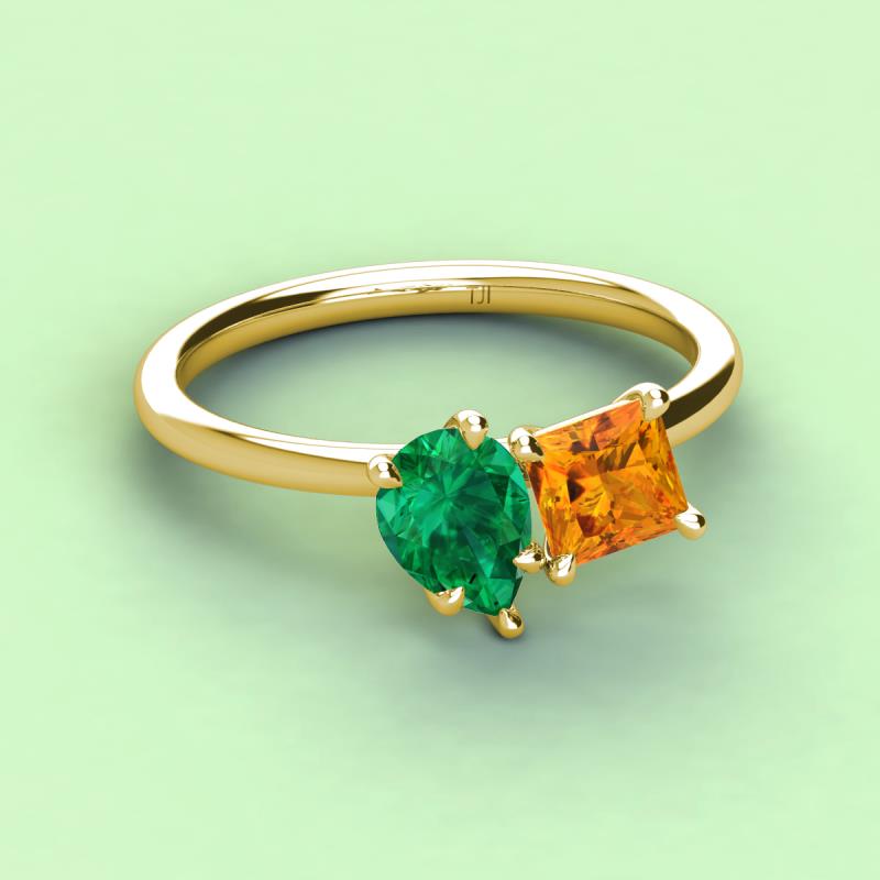 A beautiful symbol of everlasting love, this duo two-stone ring showcases a pair of Pear Shape Emerald shimmering alongside of a luminous Princess Shape Citrine crafted beautifully that represents two of you together.