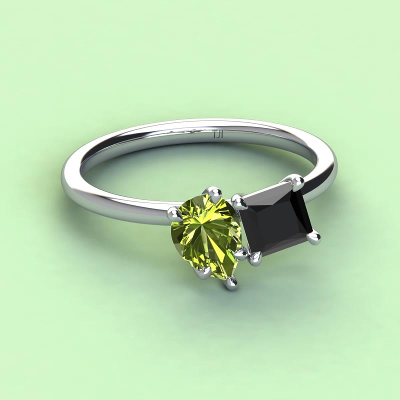 A beautiful symbol of everlasting love, this duo two-stone ring showcases a pair of Pear Shape Peridot shimmering alongside of a luminous Princess Shape Black Diamond crafted beautifully that represents two of you together.