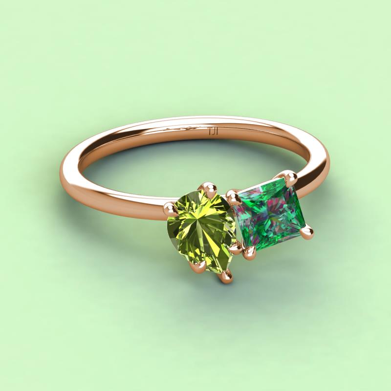 A beautiful symbol of everlasting love, this duo two-stone ring showcases a pair of Pear Shape Peridot shimmering alongside of a luminous Princess Shape Lab Created Alexandrite crafted beautifully that represents two of you together.