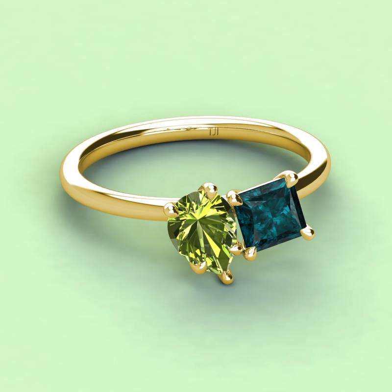A beautiful symbol of everlasting love, this duo two-stone ring showcases a pair of Pear Shape Peridot shimmering alongside of a luminous Princess Shape London Blue Topaz crafted beautifully that represents two of you together.
