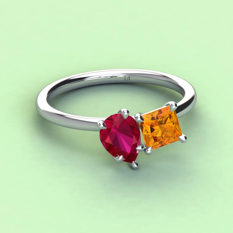 A beautiful symbol of everlasting love, this duo two-stone ring showcases a pair of Pear Shape Ruby shimmering alongside of a luminous Princess Shape Citrine crafted beautifully that represents two of you together.