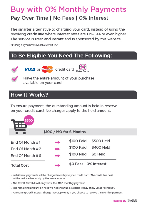 Splitit’s monthly payment solution does not incur interest or late fees.